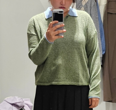 보카시 느낌의 그린컬러의 몸판과 하늘색 카라 배색니트는 소매 포인트가 들어가 있어