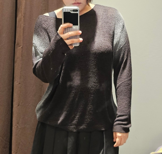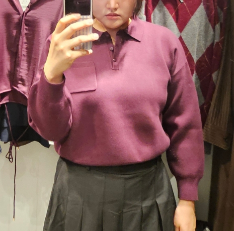 다만 보트넥 디자인은 앞목이 높아 목이 짧은 사람에게는 다소 답답할 수 있다. (연보라 니트)