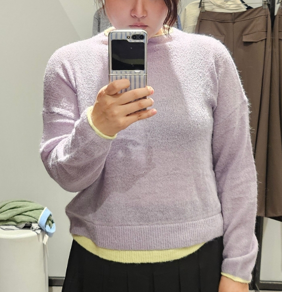 연보라색 니트는 사진상으로는 보라빛이 강하지만 실제로는 핑크와 연노랑이 섞여