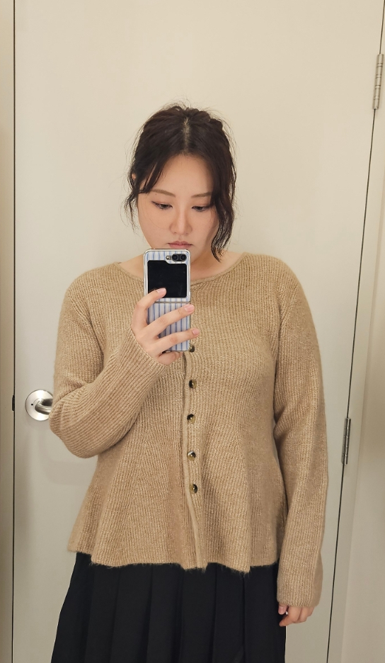 베이지 계열 기본 가디건은 심플한 디자인에 부드러운 실루엣으로 부담 없이 입기 좋다.