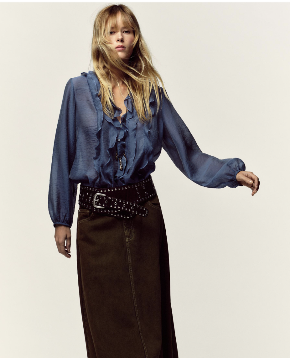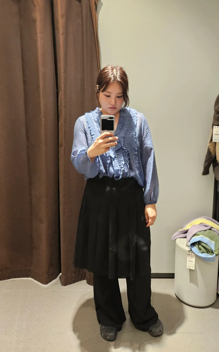 1. 은은한 블루 러플 블라우스 — 보호시크룩 감성의 하객룩
